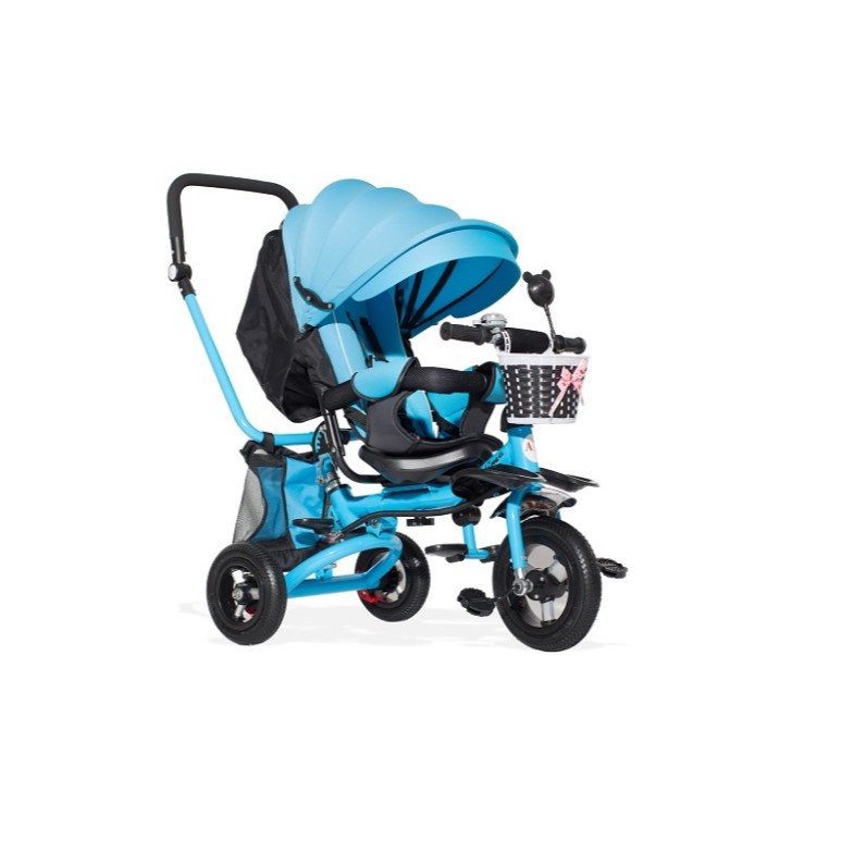 Tricikl Playtime plavi za decu od 12 meseci + sa sigurnosnim pojasem, rotirajućim sedištem, tendom i roditeljskom ručkom. Stabilan, udoban i pogodan za prve vožnje.